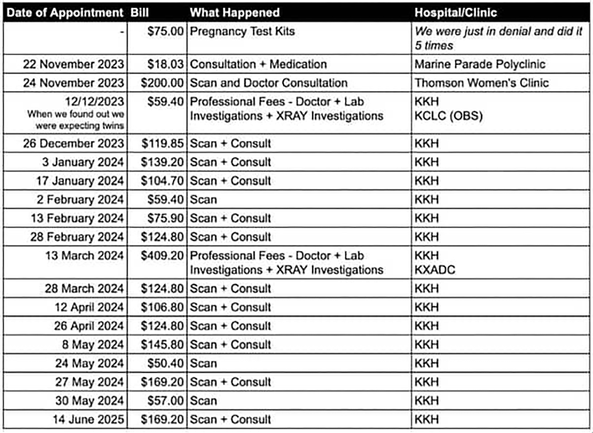 Sarah: Our total cost from the pregnancy test kits all the way to delivery came to $6,293.92. As you already know, we opted for the subsidized route in KKH. As a twin pregnancy is considered high risk, we knew that we would likely end up at KKH either way even if we had gone with a private gynaecologist.