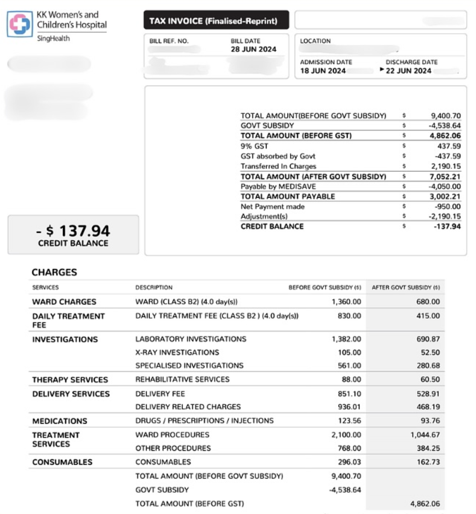 As for the twin boys, their total bill was $3,148.38. Anders required additional phototherapy during his 6-day stay in the Special Care Nursery (SCN). We’re very thankful they did not require admission to the NICU. The SCN nurses cared for them so well that I was able to get proper rest. I chose a B2 ward as it was affordable and practical. I also appreciated being able to seek help from the nurses nearby whenever needed.